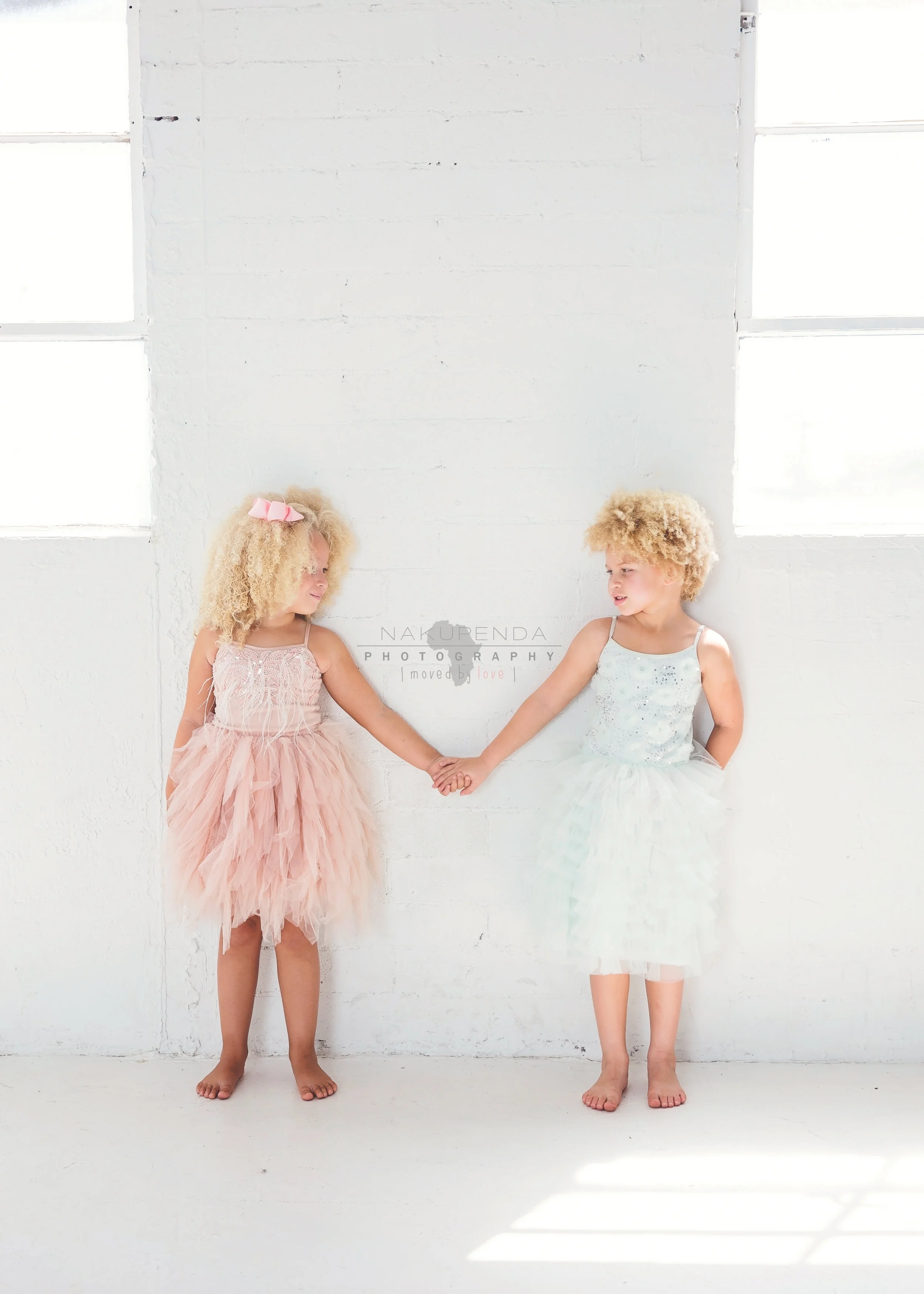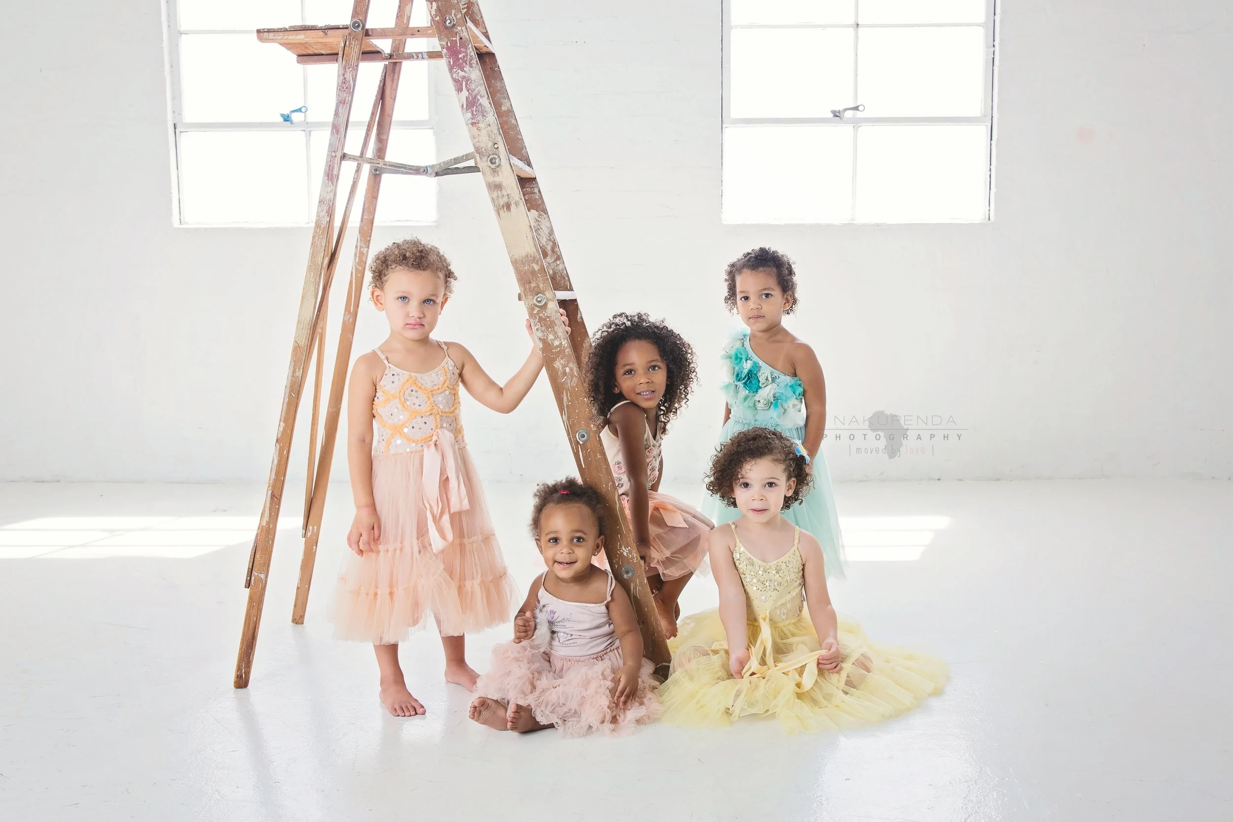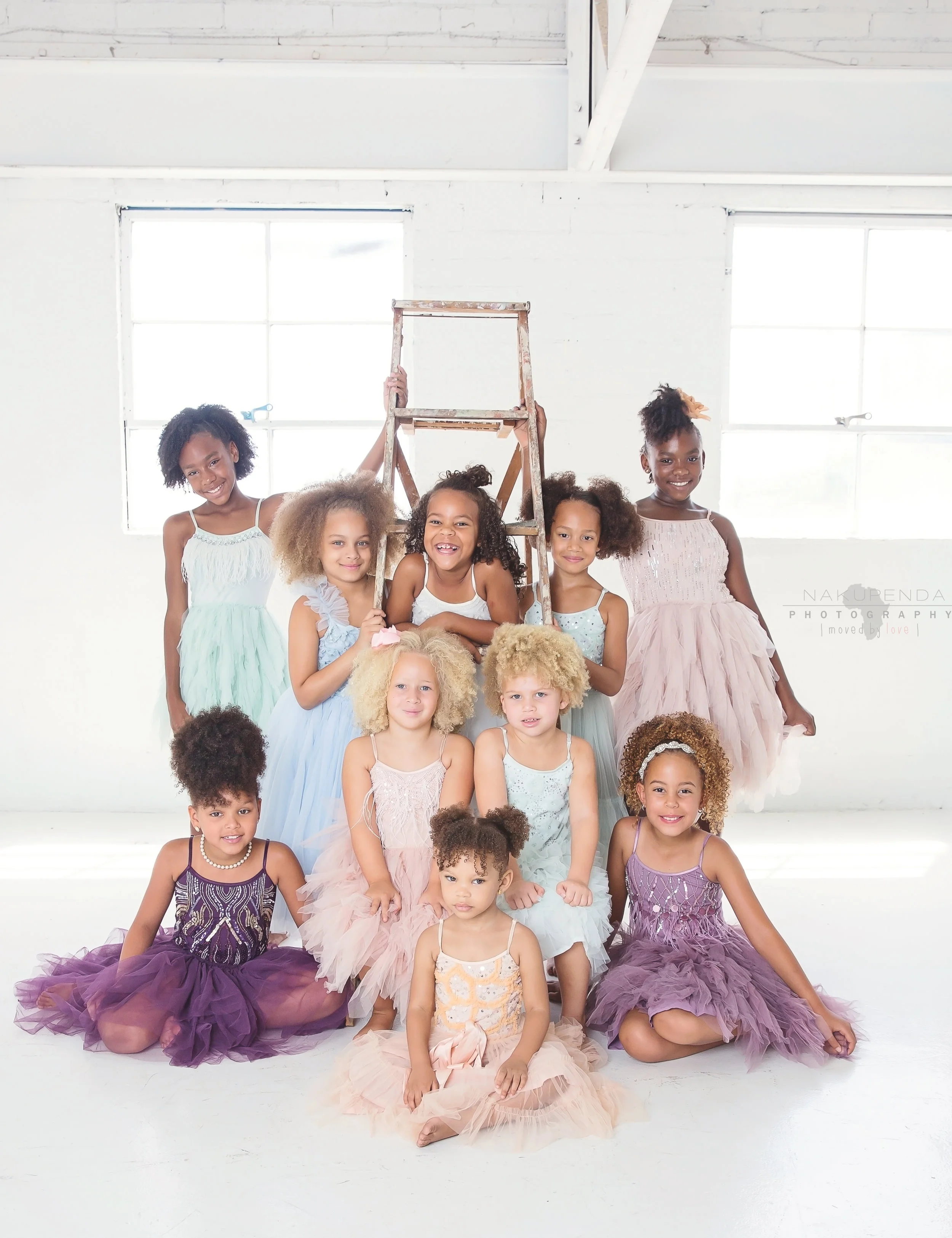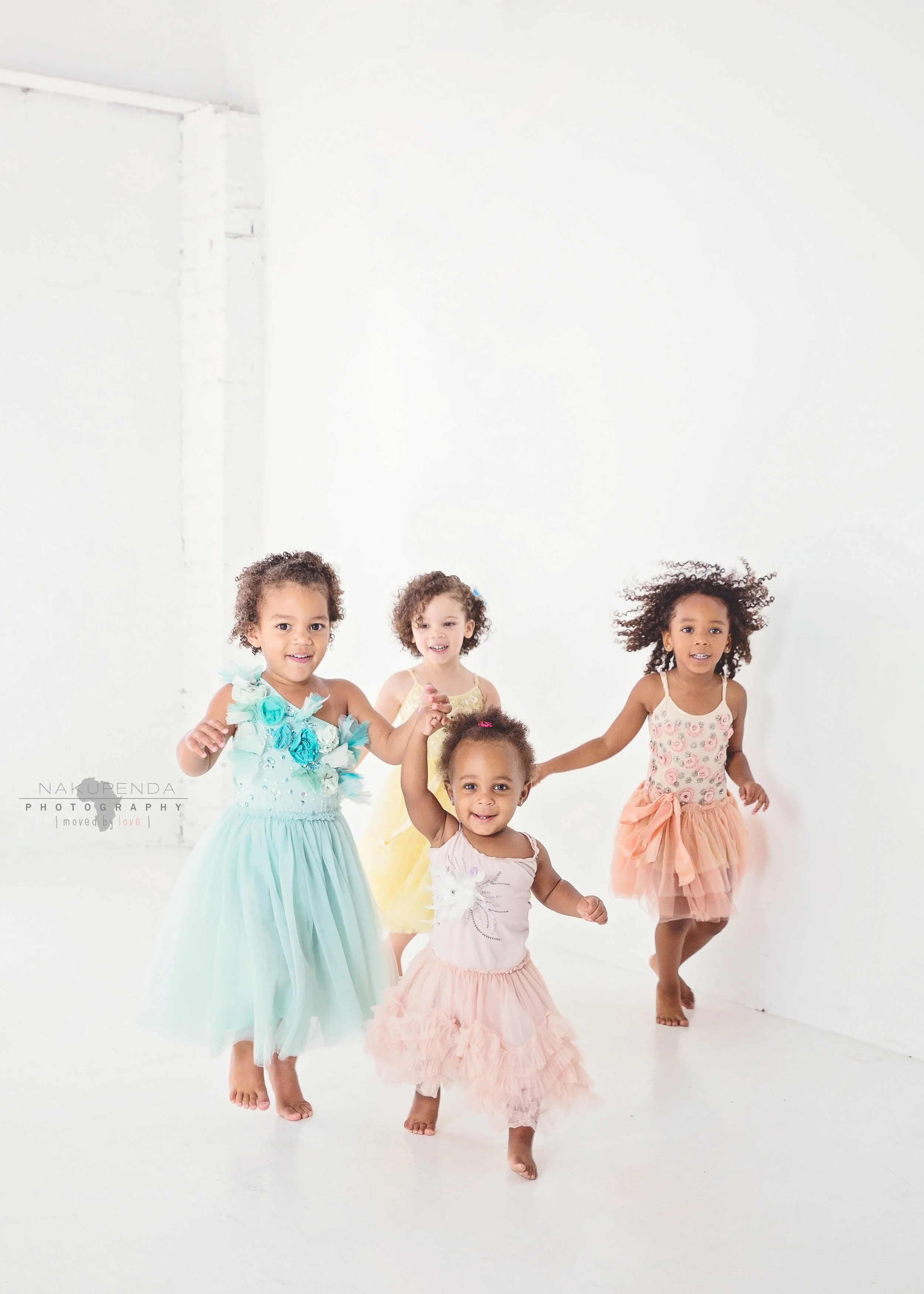 We wanted to keep this studio session simple. Our previous photo shoots have had crazy costumes, props, and themes. For this session though, we decided to go with clean and simple. We photographed the girls at Block Studio, with a white brick background, and pastel colored dresses. We wanted to emphasize the natural beauty of the girls we were photographing. The white brick and pastels would make everything about these sweet faces stand out in comparison. Because of the set's simplicity, we were able to capture the variations in hair color and skin tone arrayed in our studio that morning.