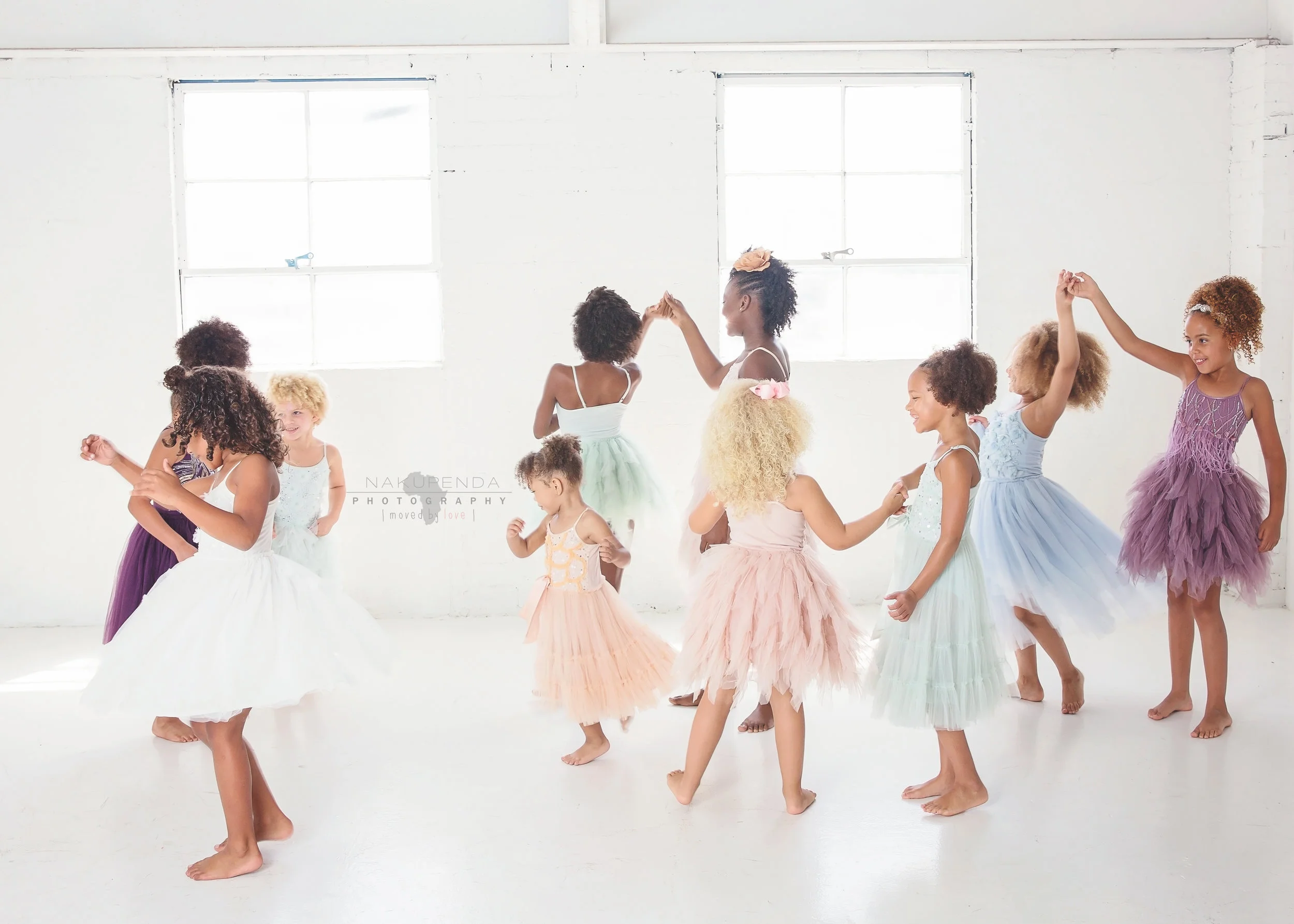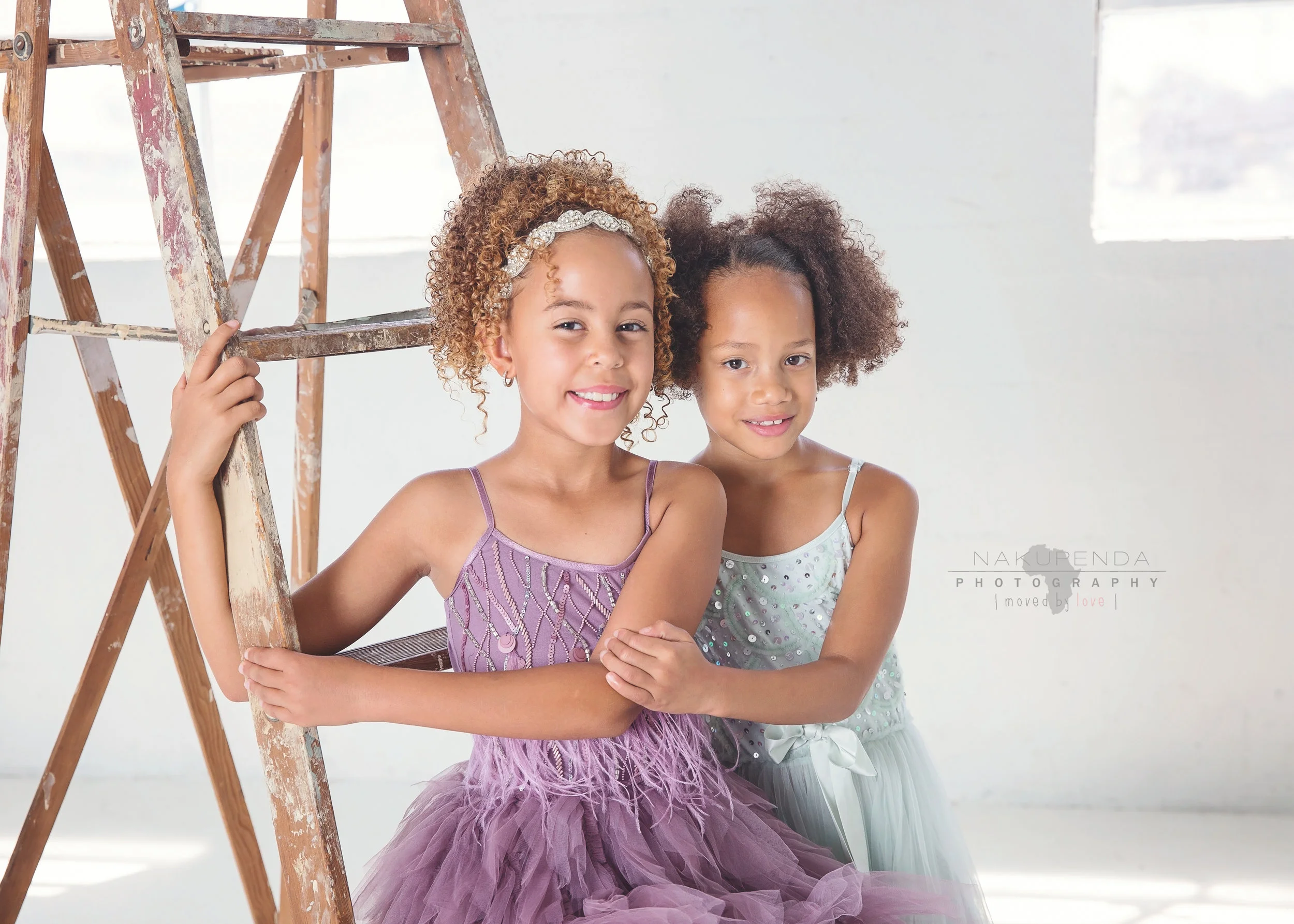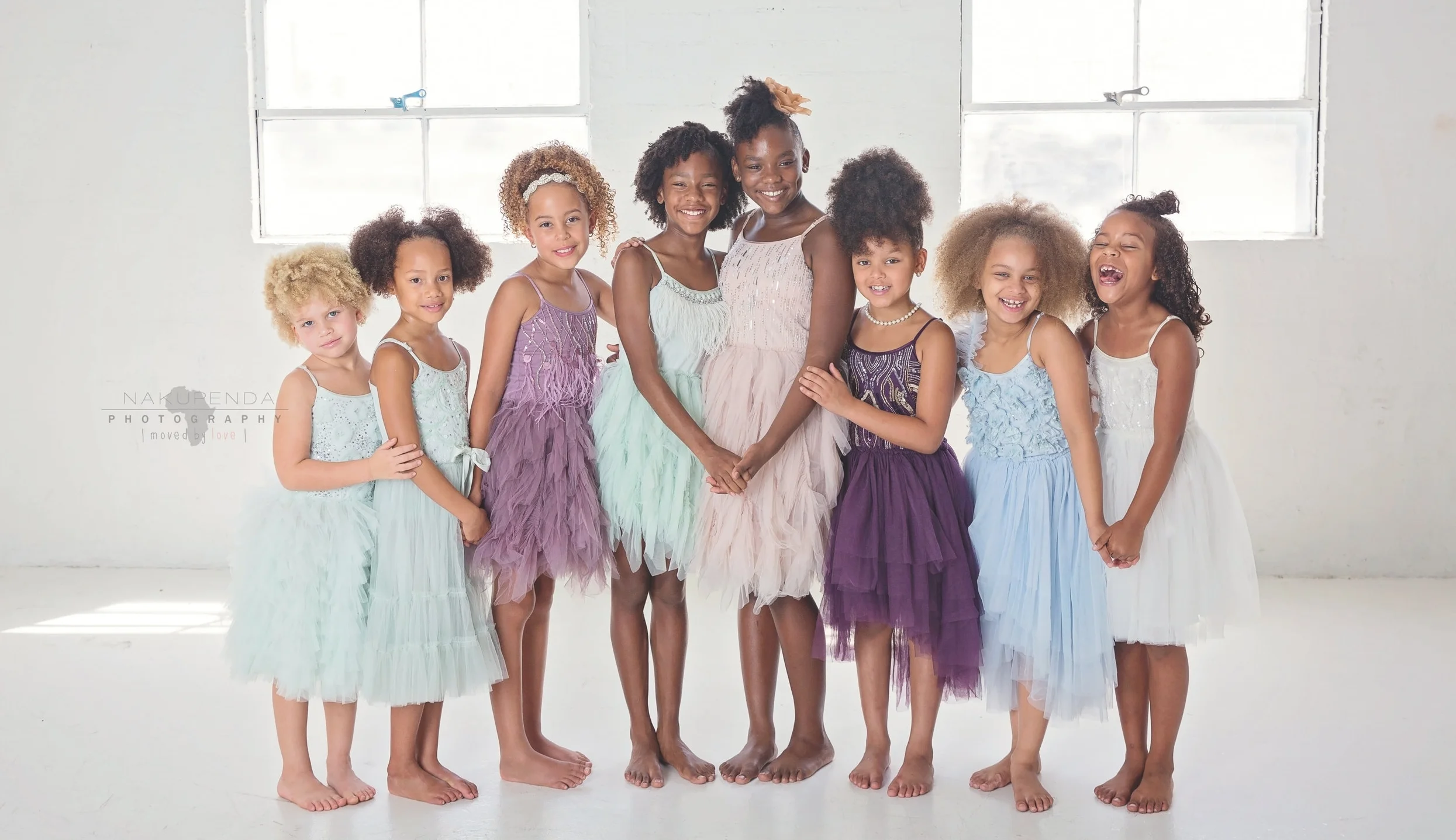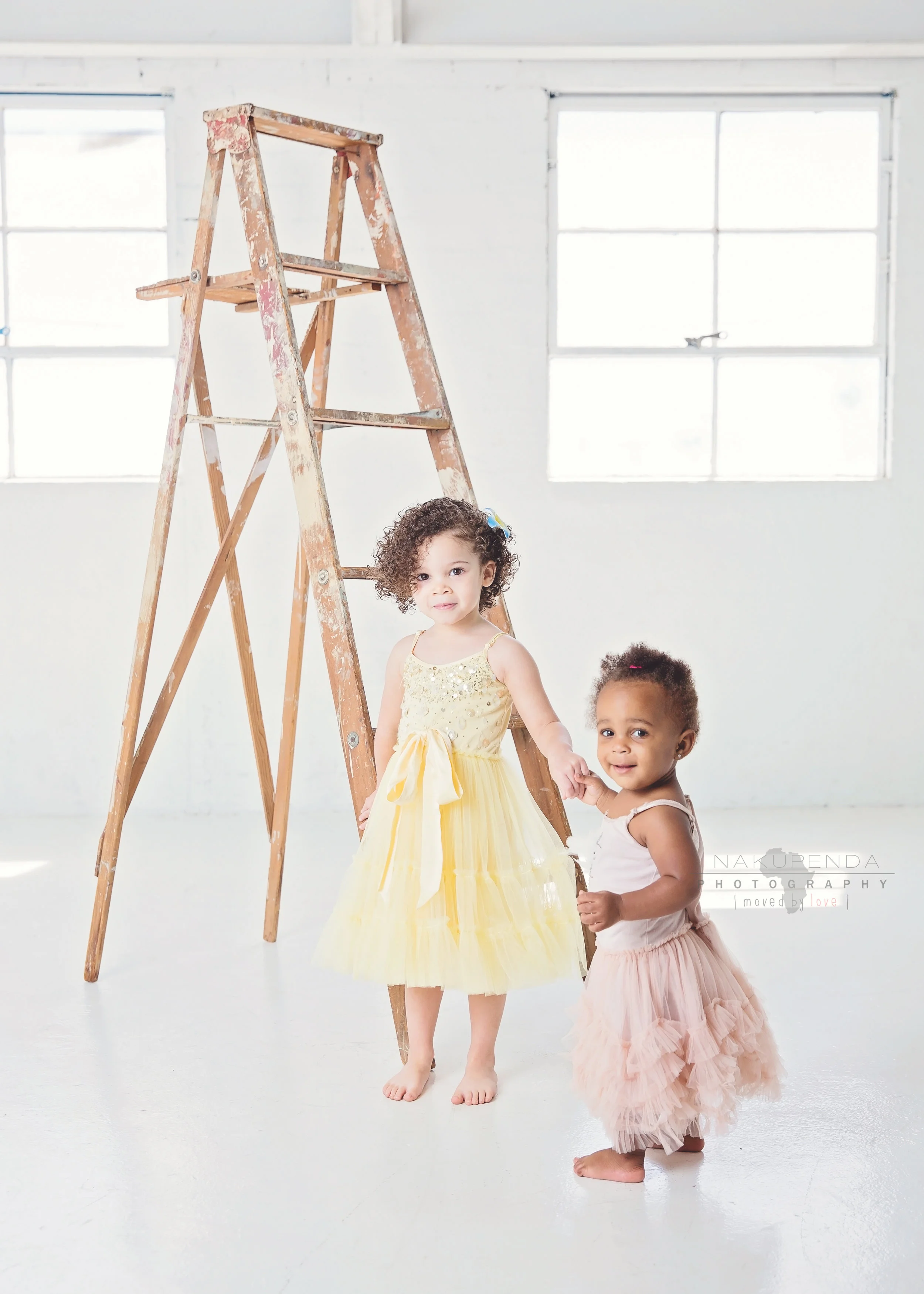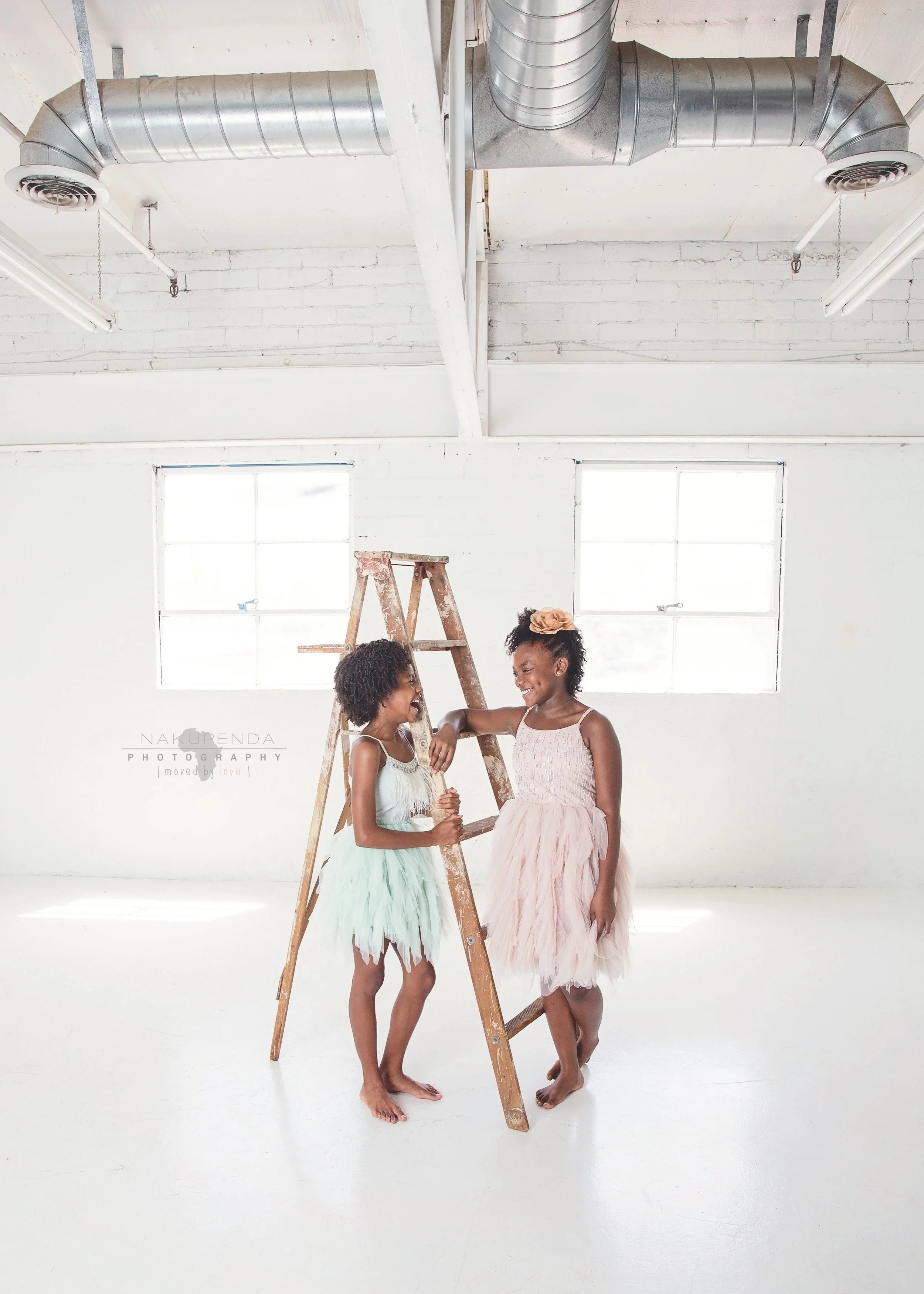 We wanted to keep this studio session simple. Our previous photo shoots have had crazy costumes, props, and themes. For this session though, we decided to go with clean and simple. We photographed the girls at Block Studio, with a white brick background, and pastel colored dresses. We wanted to emphasize the natural beauty of the girls we were photographing. The white brick and pastels would make everything about these sweet faces stand out in comparison. Because of the set's simplicity, we were able to capture the variations in hair color and skin tone arrayed in our studio that morning.