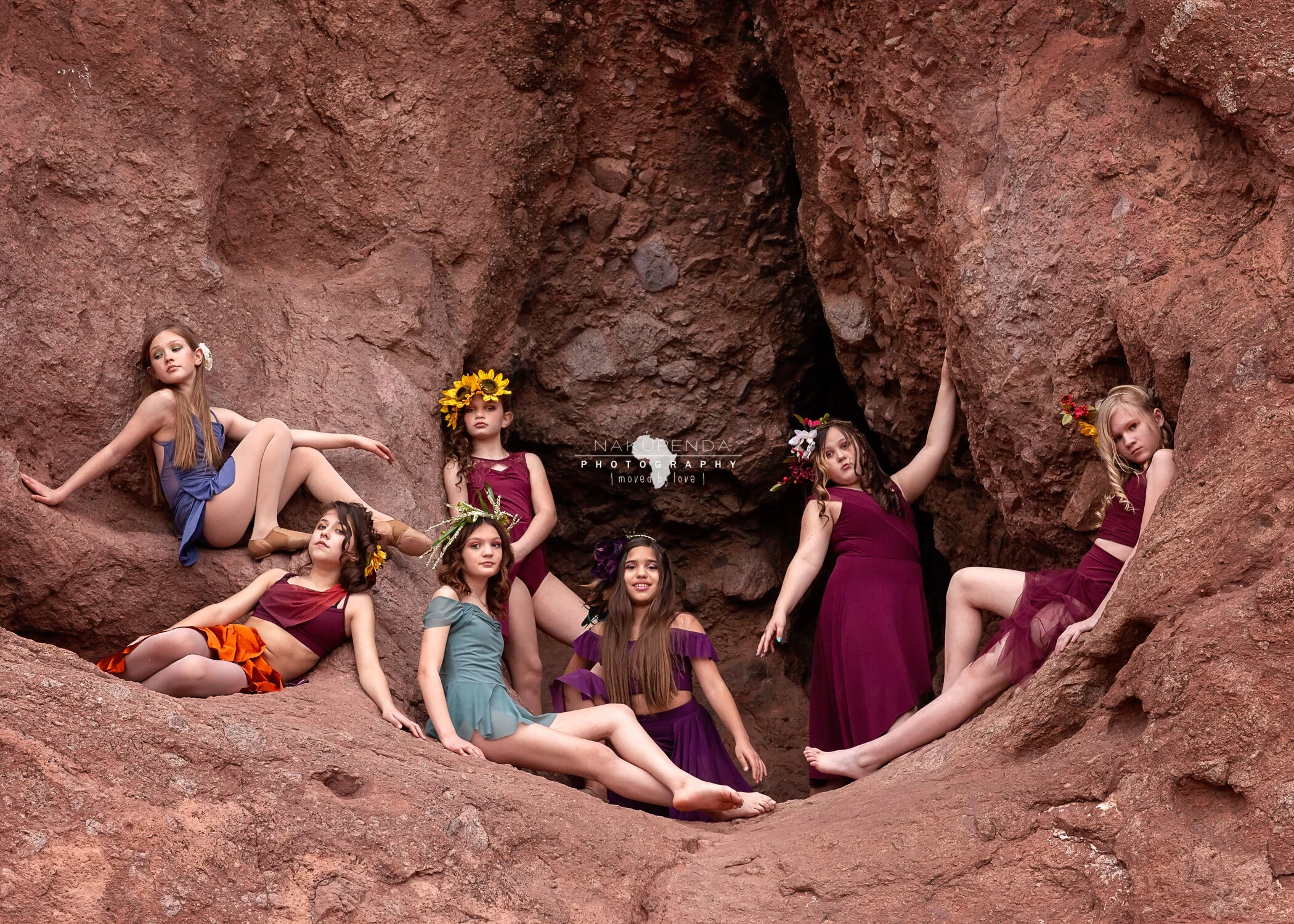 We knew Arizona ‘winter’ weather was the perfect time to create this project. Within the span of about 60 days we see fall leaves, snow on the mountain, and wildflowers blooming. I felt Papago with its red tinged rock was the perfect place to begin our series. Jenny picked out fall colored dance outfits and created stunning fall inspired floral hair pieces. Makeup was done by the talented Makenzie Wisniewski, a dancer at RMDC.