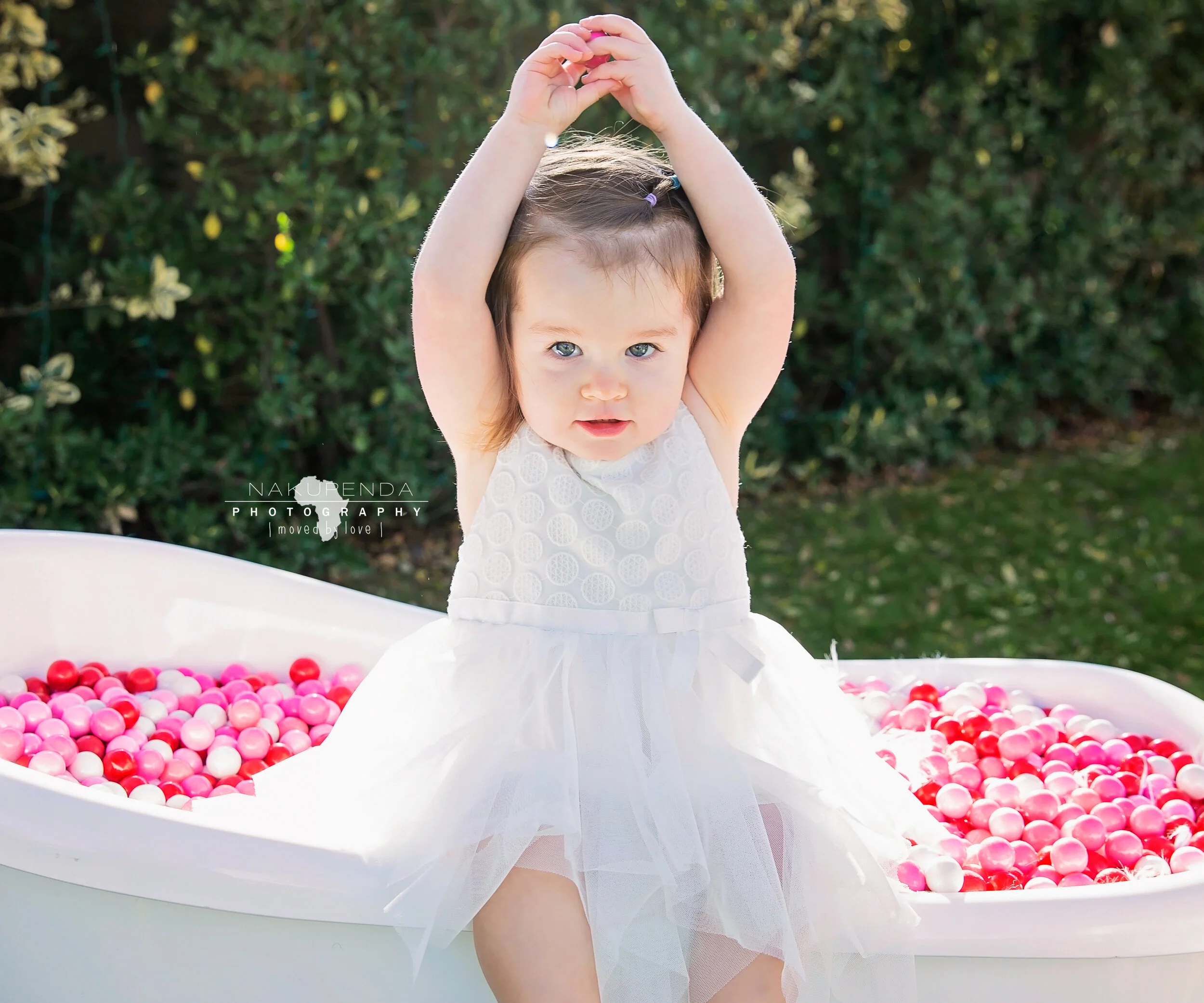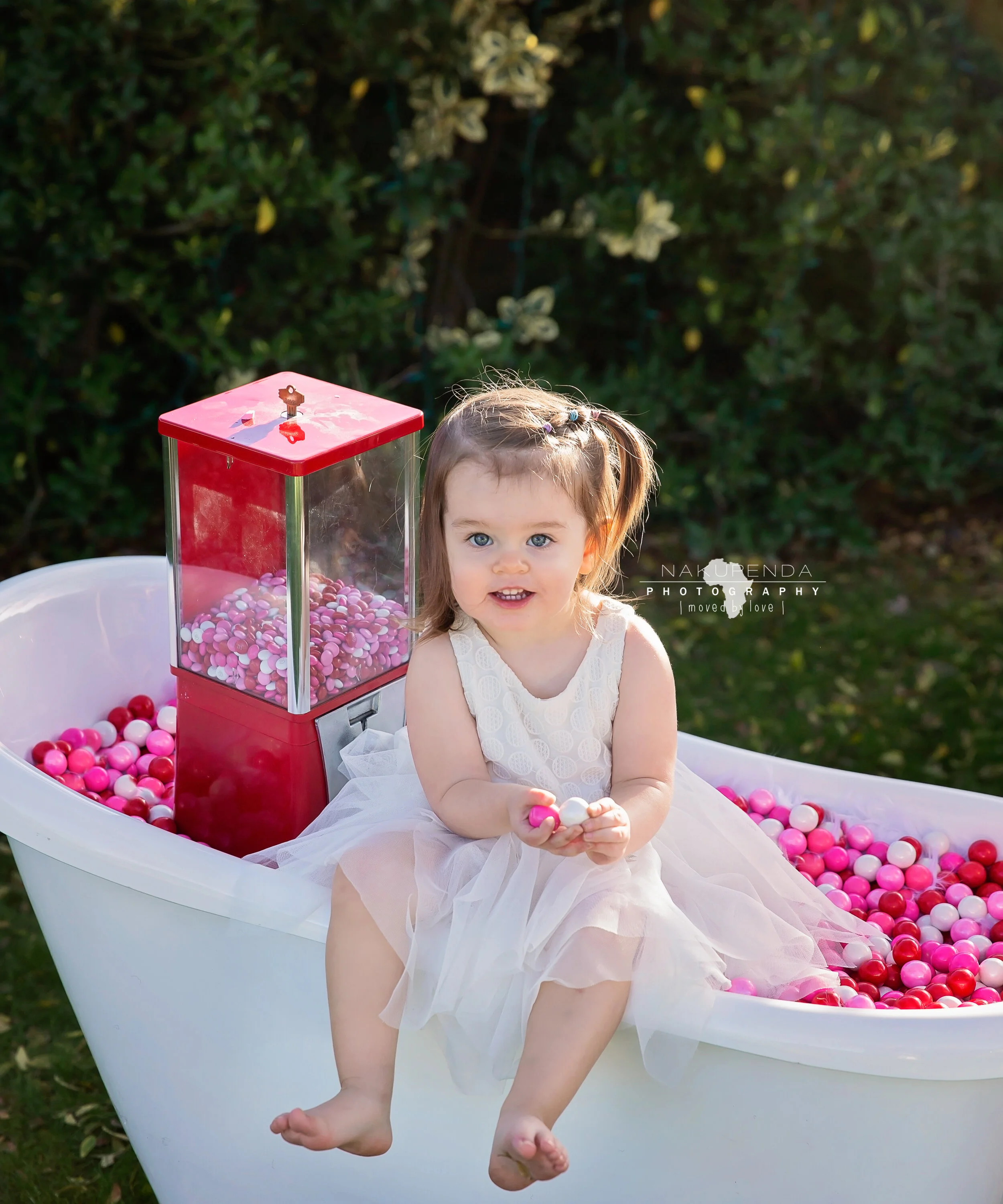 First you take the gum balls and you pour them into a tub for the kids to play (Be sure to watch carefully or the babies will pop a whole gum ball into their mouth the moment they touch the candy). Add one candy dispenser full of m&ms and challenge the kids to get the m&ms out (but don’t give them any quarters). Next challenge the kids to lay on the gum balls or dig their toes into the candy and enjoy the sensory experience. Finally grab a handful of large sweethearts and toss them at your child while they giggle and protect themselves with a clear umbrella.