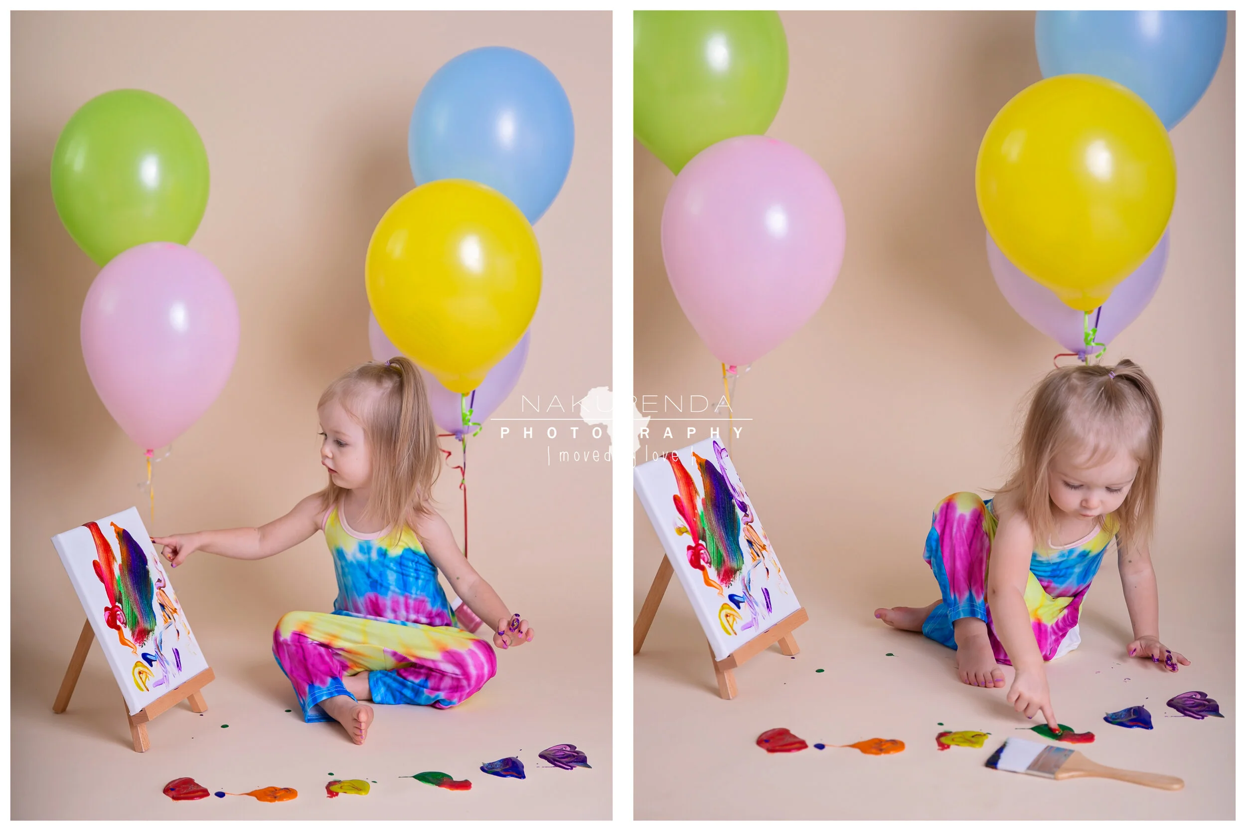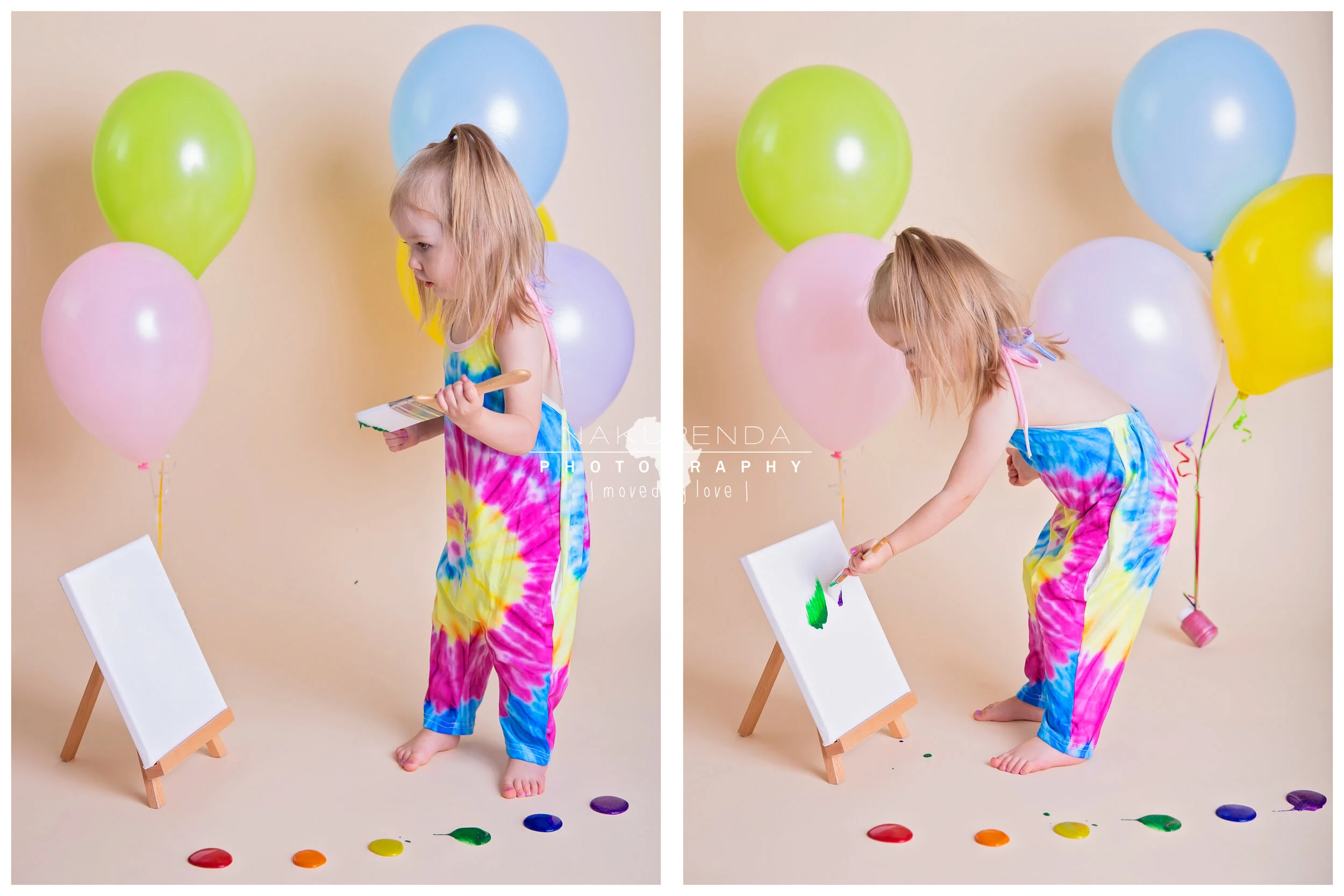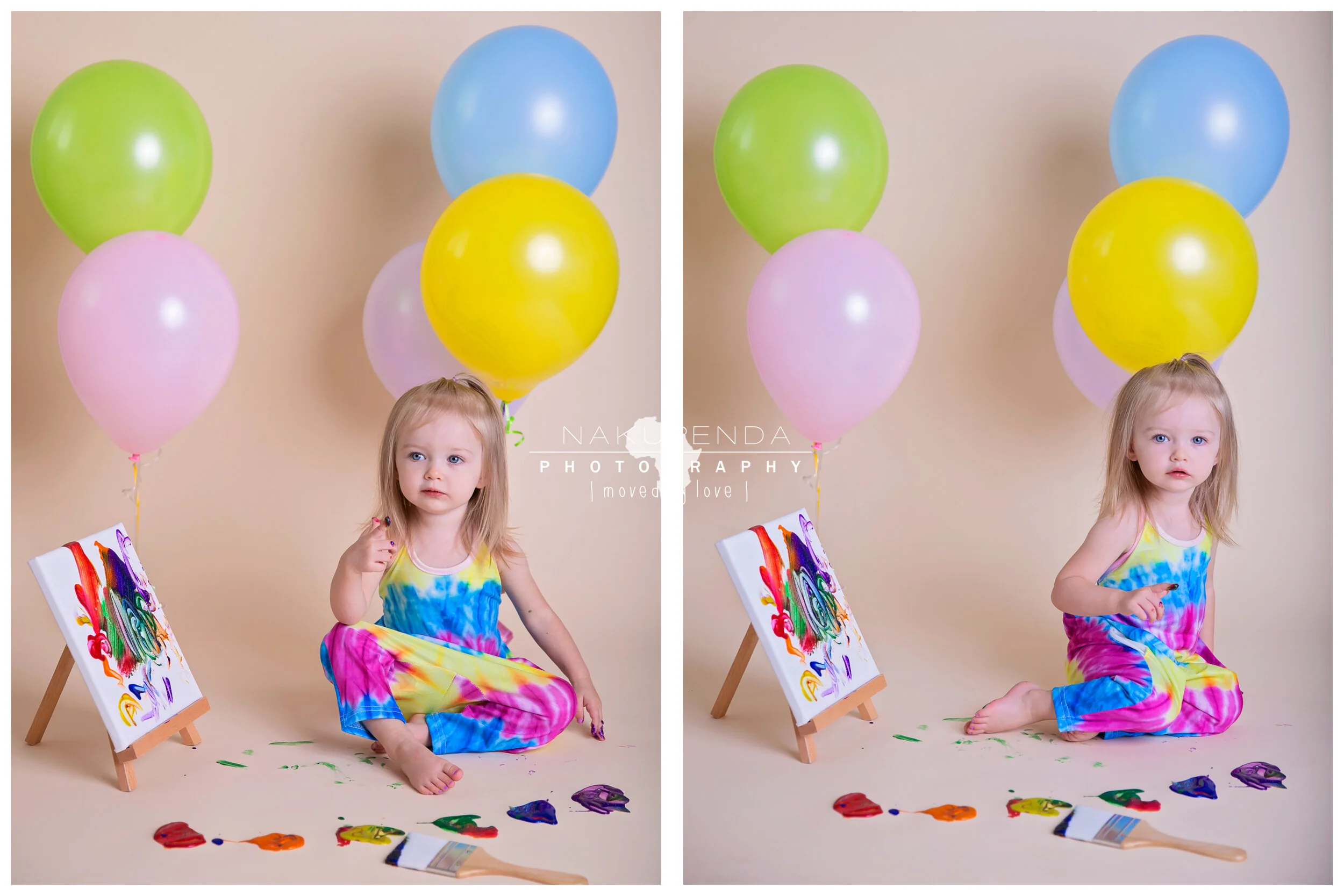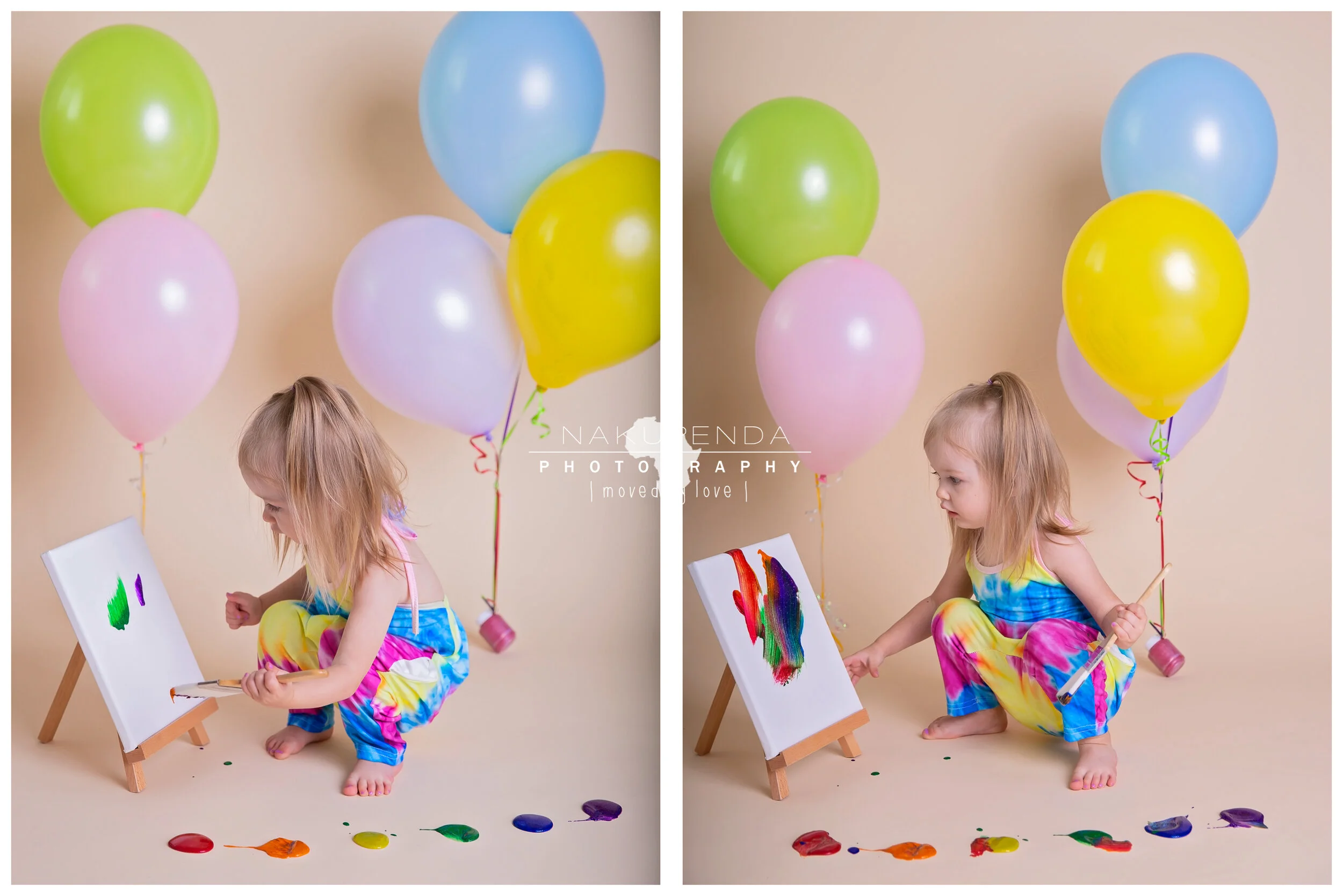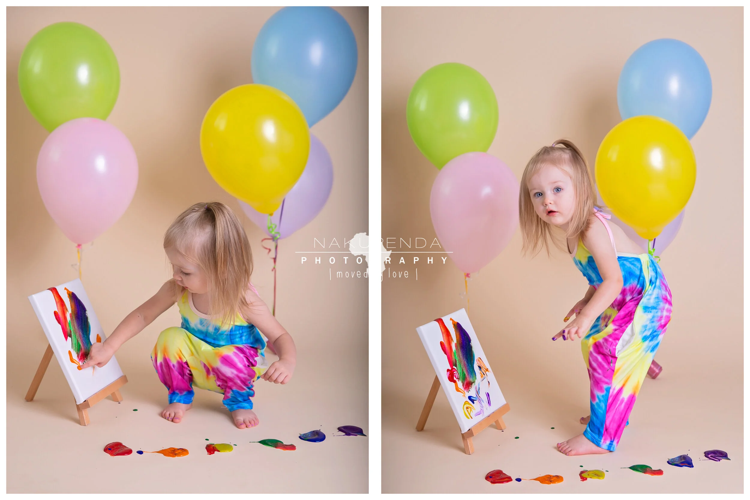 As we planned this sweet girls birthday portraits, I wanted to do something different that she would truly enjoy. After all I’ve spent the last year trying to convince her to like me and I am FINALLY convincing her that seeing me is fun. The MOST fun theme I could think of, of course, involved making a mess, so I proposed a paint smash to mom. Turns out she’s a budding artist and the theme could not have fit her personality any better. It took less than a minute for her to dive right in to this session and less than 20 to have painted 3 balloons, 2 canvasses and her own face. It was a perfect way to celebrate her 2 full years on earth and I cannot wait to see what the next year brings for her!