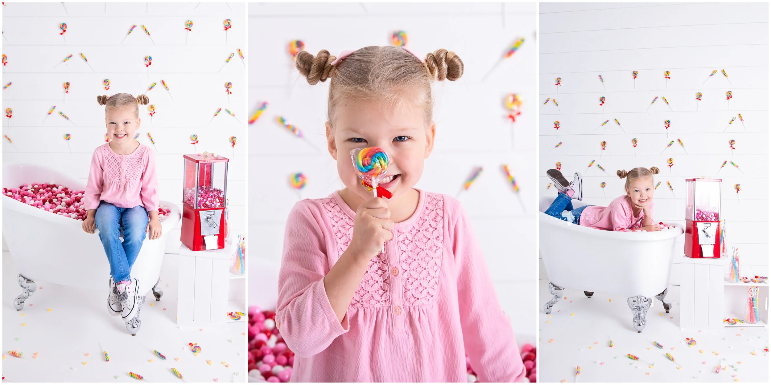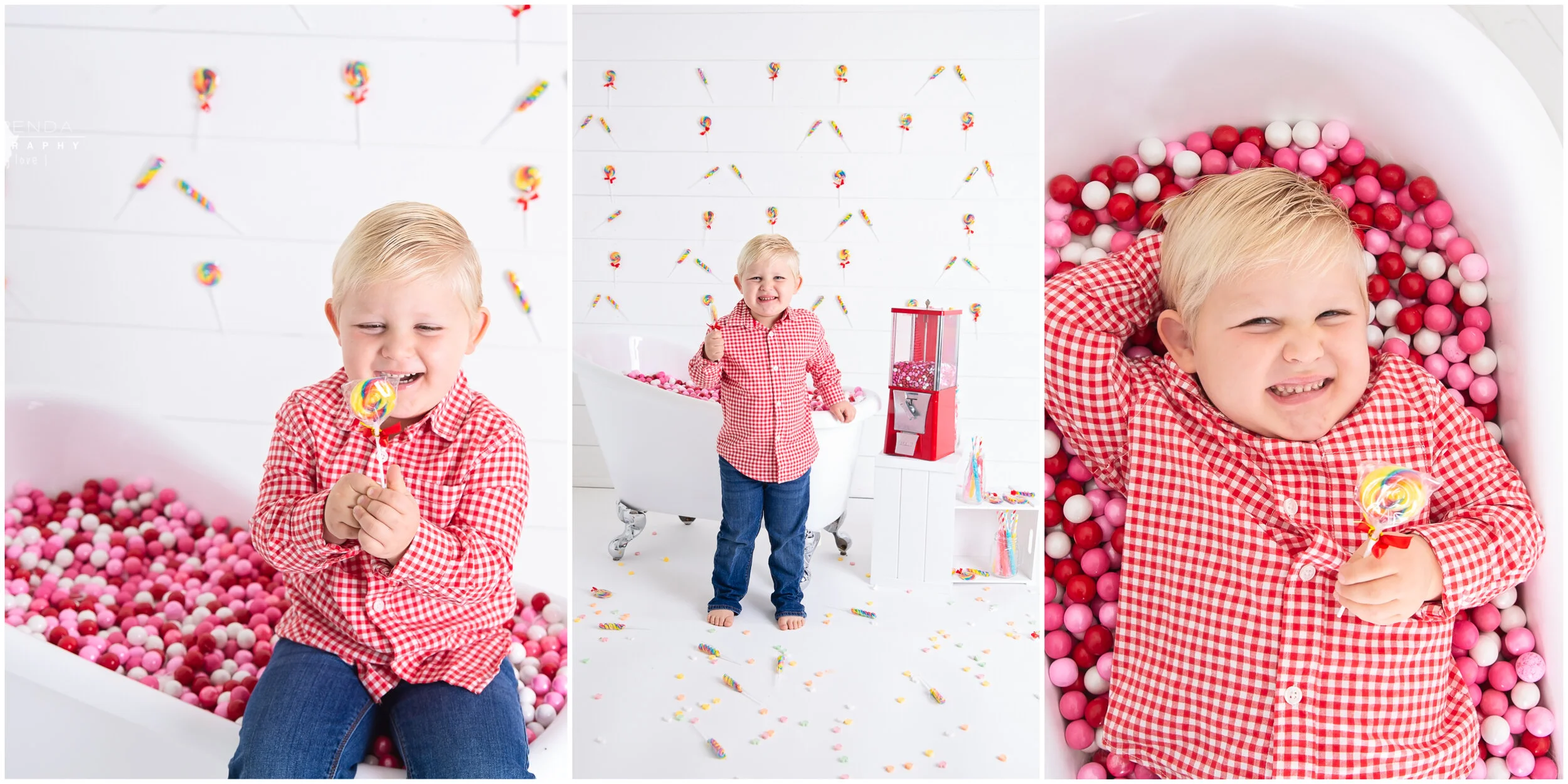 A few years ago I introduced monthly calendar sessions. These are limited engagement themed sessions celebrating the major or minor holidays that fall during the month of the session. One of the themes I struggled with the most was valentines day. I didn’t want anything romantic for these sessions, after all I work with children. I also wanted the session to be fun for boys. A couple years we tried to include pets, but not everyone had them. One year I made a giant heart out of balloons with another photographer. It was fun, but it felt wasteful to use all those balloons for just one session. Then the following year I struck upon an idea that I just KNEW would be a winner, a candy themed valentines session! It was perfect. It celebrated these little sweet loves in a sweet way they were sure to enjoy. Last year I introduced the tub full of gumballs but this year I knew I had to take it one step further….