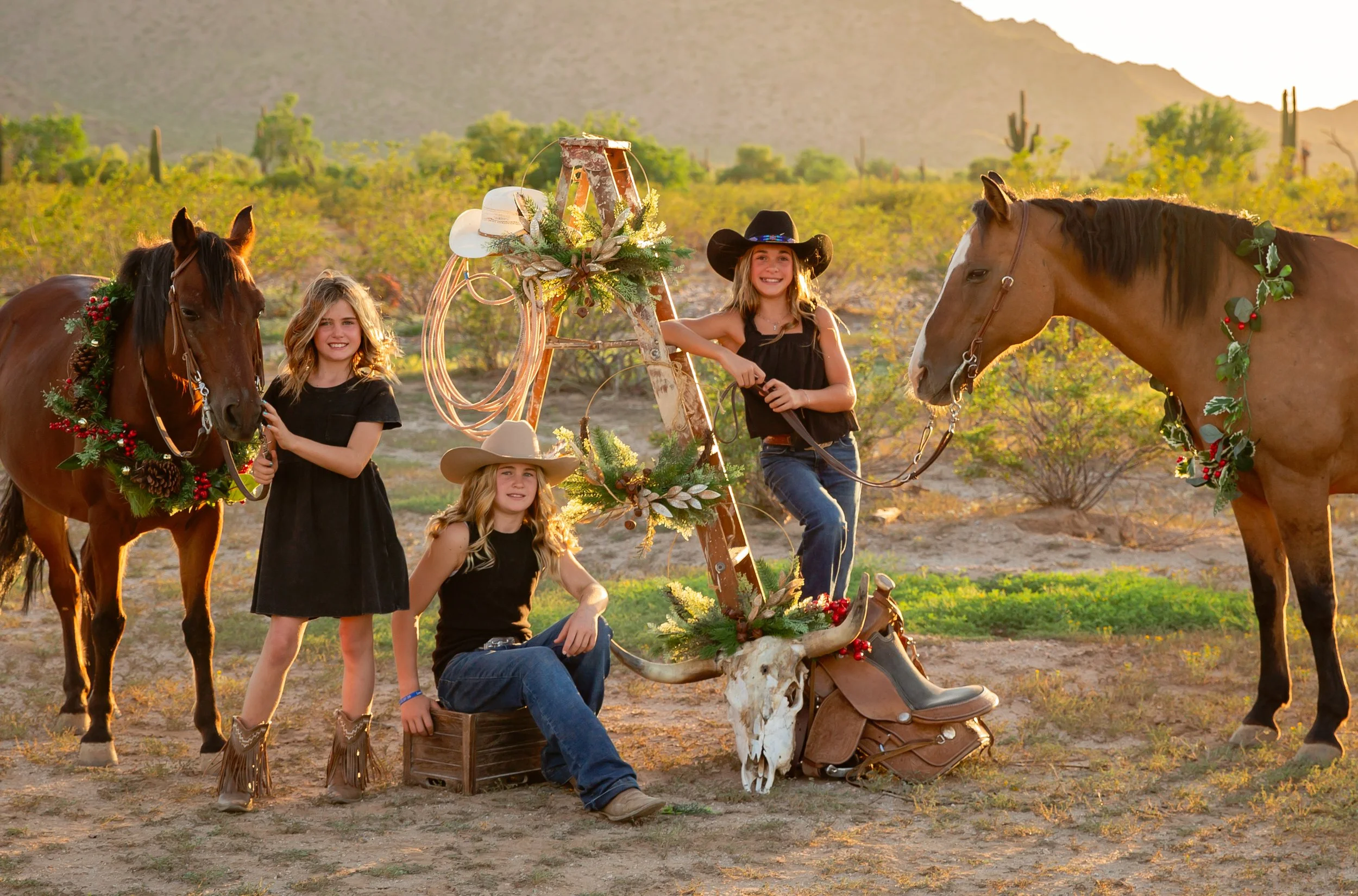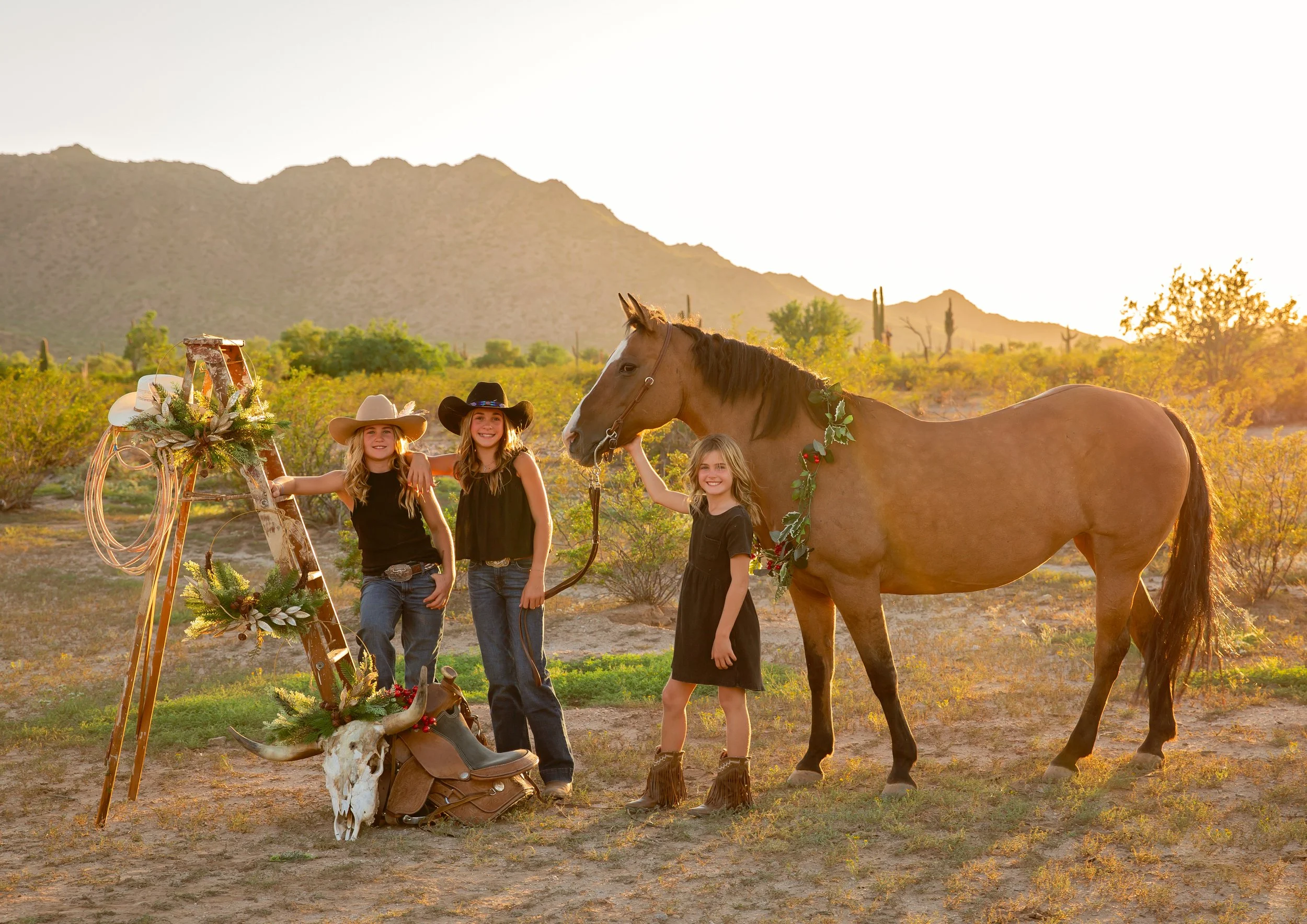 What makes these sessions so special is the way they capture authentic Arizona vibes. Families can dress in a relaxed western style that feels more like “them”, kids will naturally grin while petting the horses, and everyone will feel relaxed in the beauty of the desert. These won’t just be pictures; they’ll be memories of Christmas joy wrapped in the glow of the sunset in the Santan Mountains.